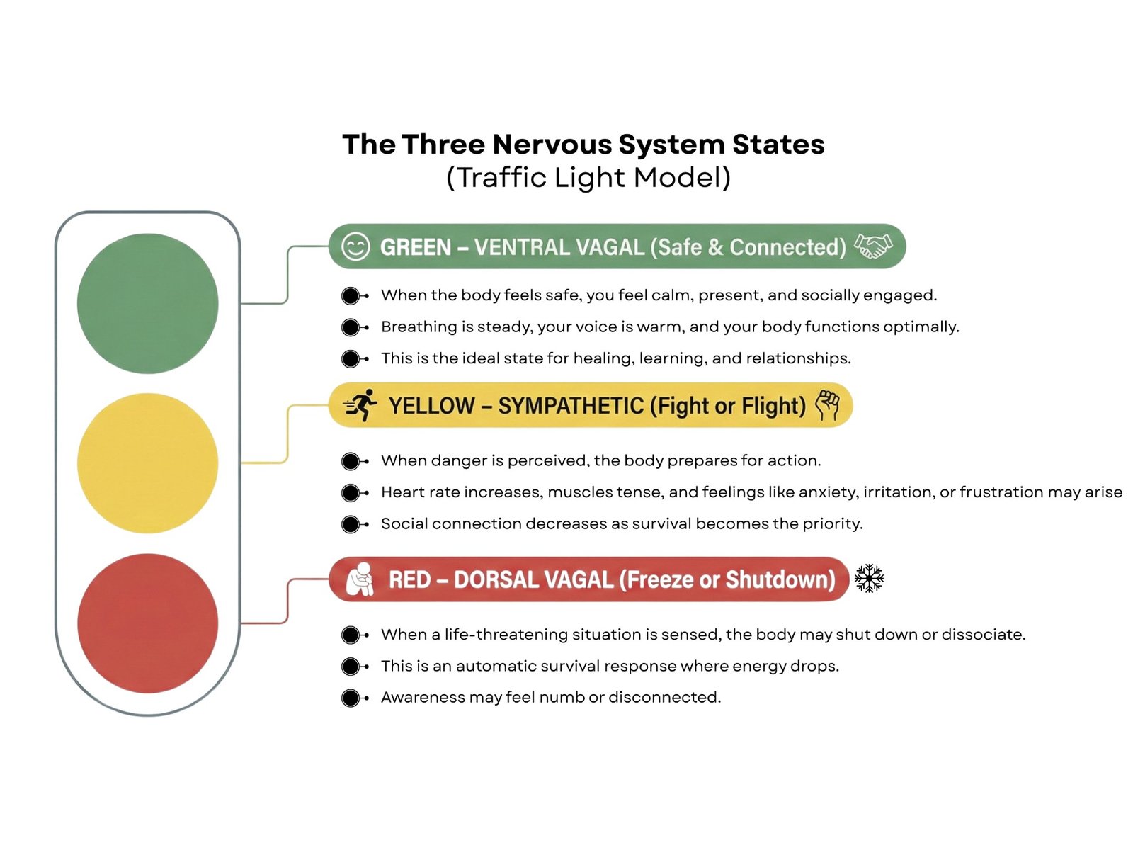 Green – Ventral Vagal (Safe & Connected). When the body feels safe, you feel calm, present, and socially engaged. Breathing is steady, your voice is warm, and your body functions optimally. This is the ideal state for healing, learning, and socializing.